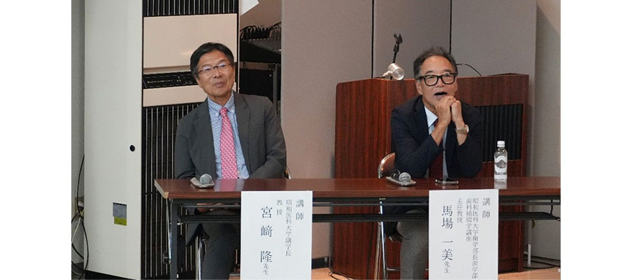 講師にはこの分野での第一人者である昭和医科大学副学長 宮﨑 隆 教授、同大学歯学部長 歯科補綴学講座 馬場 一美 教授のお二人をお迎えし、他支部よりご来場された先生方、webにてリモート参加された先生方も含めて多くの先生方にご聴講いただきました。